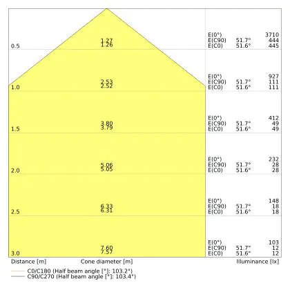 Beispiel: Wird eine Lampe mit einem Abstrahlwinkel von 60 Grad an der Decke (2,5 m Höhe) angebracht, erzeugt sie einen Lichtkegel von 2,9 Metern Durchmesser. Hat die Lampe hingegen einen Abstrahlwinkel von 120 Grad, beträgt der Lichtkegel 8,7 Meter im Durchmesser. |