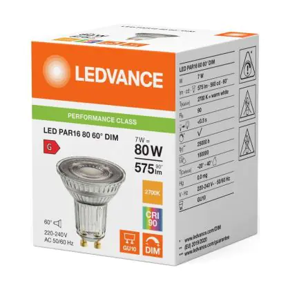 Die Ledvance LED PAR16 GU10 Reflektor 7W 575lm 60D - 927 Extra Warmweiß | Höchste Farbwiedergabe - Dimmbar - Ersatz Für 80W ist eine effiziente GU10 LED-Lampe und der perfekte Ersatz für Ihre konventionelle Halogenlampe mit 80W und einem GU10-Sockel, bei welchem die zwei Stifte einen Abstand von 10 mm zueinander haben. Zudem strahlt das Produkt Licht in der Farbtemperatur 2700K - Extra Warmweiß aus und punktet durch eine lange Lebensdauer.