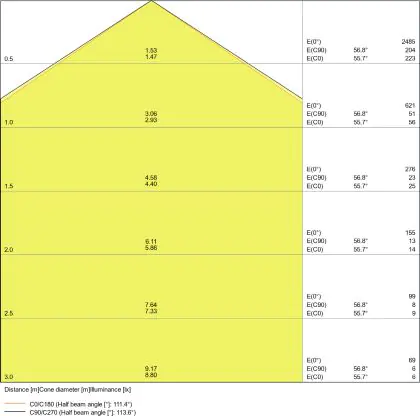 Beispiel: Wird eine Lampe mit einem Abstrahlwinkel von 60 Grad an der Decke (2,5 m Höhe) angebracht, erzeugt sie einen Lichtkegel von 2,9 Metern Durchmesser. Hat die Lampe hingegen einen Abstrahlwinkel von 120 Grad, beträgt der Lichtkegel 8,7 Meter im Durchmesser. |