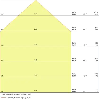 Beispiel: Wird eine Lampe mit einem Abstrahlwinkel von 60 Grad an der Decke (2,5 m Höhe) angebracht, erzeugt sie einen Lichtkegel von 2,9 Metern Durchmesser. Hat die Lampe hingegen einen Abstrahlwinkel von 120 Grad, beträgt der Lichtkegel 8,7 Meter im Durchmesser. |