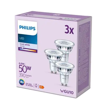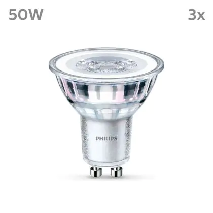 Die Lumeneffizienz des GU10 LED-Strahlers von Philips liegt bei lm/W. Herkömmliche GU10-Strahler hingegen besitzen ein Lumen zu Watt-Verhältnis von 10-15 lm/W. Somit sparen Sie allerhand Energiekosten. Hinzu kommt die lange Lebensdauer des GU10 LED-Strahlers von 15000. Somit spendet er deutlich länger Licht als ein herkömmlicher Halogenstrahler, der mit nur rund 3000 Stunden daherkommt. Das spart Ihnen zusätzlich Austausch- und Wartungskosten.
