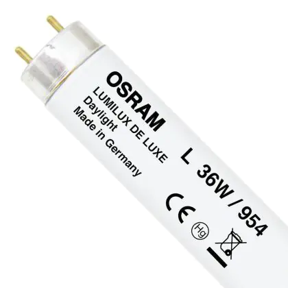 Die Osram Lumilux De Luxe T8 36W - 954 Kaltweiß | 97cm ist eine T8 Leuchtstoffröhre von Osram mit einer Länge von 970 mm. Das Produkt verfügt über 2 Pins und hat einen Durchmesser von 26 mm. Die Röhre strahlt Licht in der Farbtemperatur 5400K - Kaltweiß aus und punktet durch eine lange Lebensdauer.
